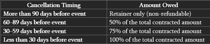 If circumstances beyond either party’s control (e.g., severe weather, government restrictions, natural disasters) prevent the event from occurring, payments made may be applied toward a rescheduled date, subject to availability. Refunds are not guaranteed due to prior labor and procurement commitments.